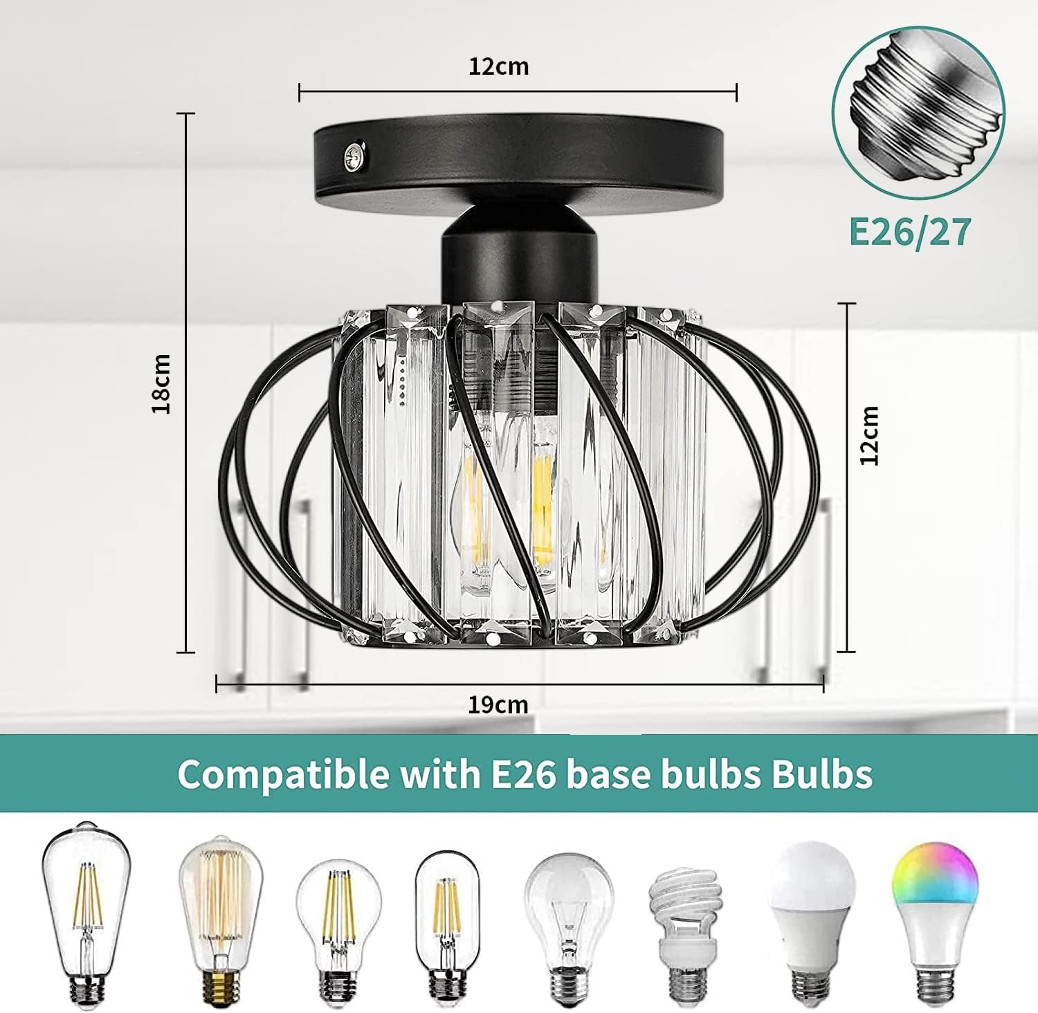 - Perfect Size: The black ceiling light has a metal shade with a diameter of 19cm, a base plate of 12cm, and a height of 18cm. It supports E27 base bulbs, compatible with LED, halogen, or incandescent bulbs.
